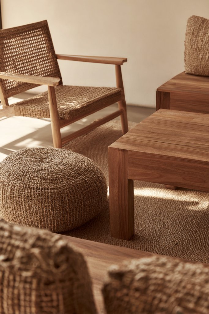 Picture a wooden coffee table with a rough, live-edge finish paired with woven rattan chairs. A jute rug underfoot adds a tactile layer that invites barefoot comfort. Natural fiber baskets hold miscellaneous items, while raw wood accents on shelves or frames bring a rustic charm. The combination of textures and earthy tones creates a warm, layered look that’s both stylish and soothing.