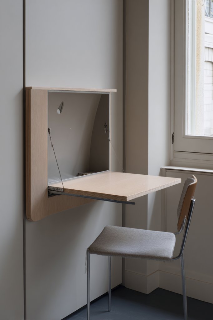 Imagine a slim, fold-down desk mounted neatly on a wall, with a simple chair tucked underneath. When folded up, it disappears, revealing a clean wall surface. When opened, it provides a sturdy surface for your laptop and essentials. Pair with minimalist shelving or storage cubes nearby for organization. The overall look is modern and uncluttered, perfect for apartment living.