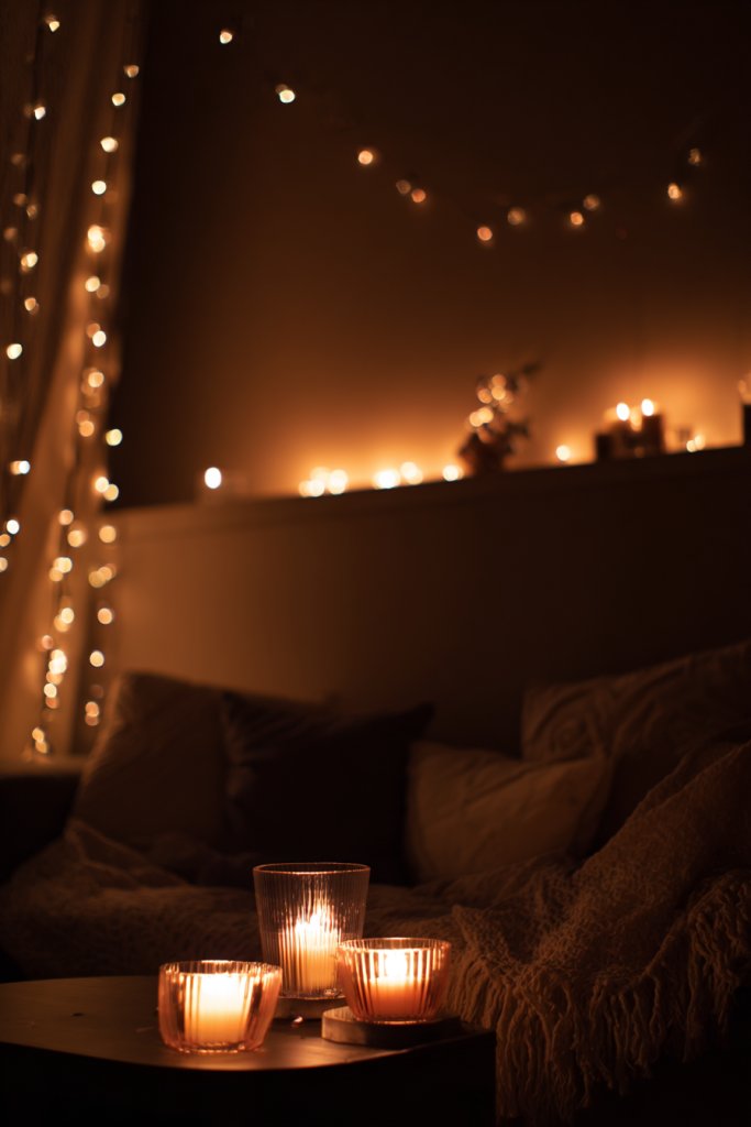 Arrange candles on trays or decorative holders on tables or shelves. Use battery-operated candles for safety and convenience. Hang or drape fairy lights strategically—around beds, mirrors, or along wall edges. Use timers or remote controls to easily switch between different lighting layers. Keep the space tidy, ensuring cords are hidden or secured to prevent tripping hazards. Regularly replace batteries and clean light fixtures.