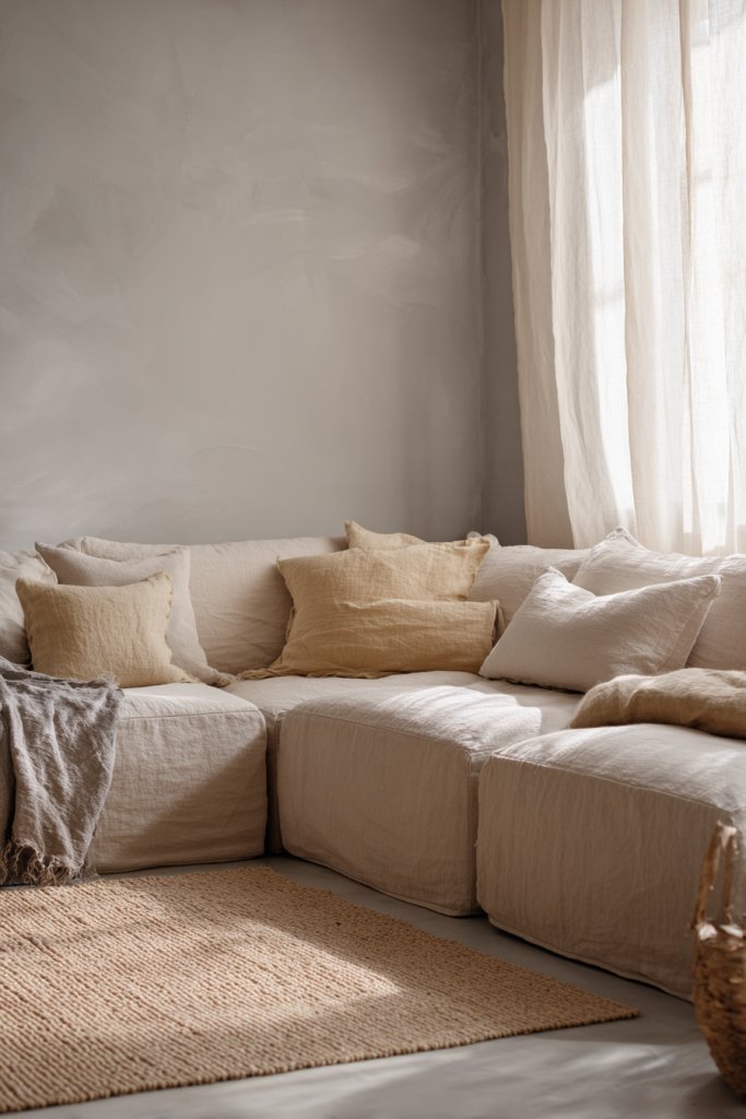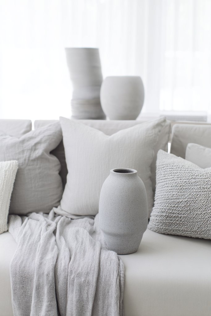 Picture a living room with a palette of soft greys, blush pinks, and warm taupes. Cushions, throws, and accessories in matching tones create a harmonious look. Subtle variations in texture—velvet, knit, or woven—add depth without disrupting the calm. The overall effect is soothing and sophisticated, inviting relaxation and mindfulness.