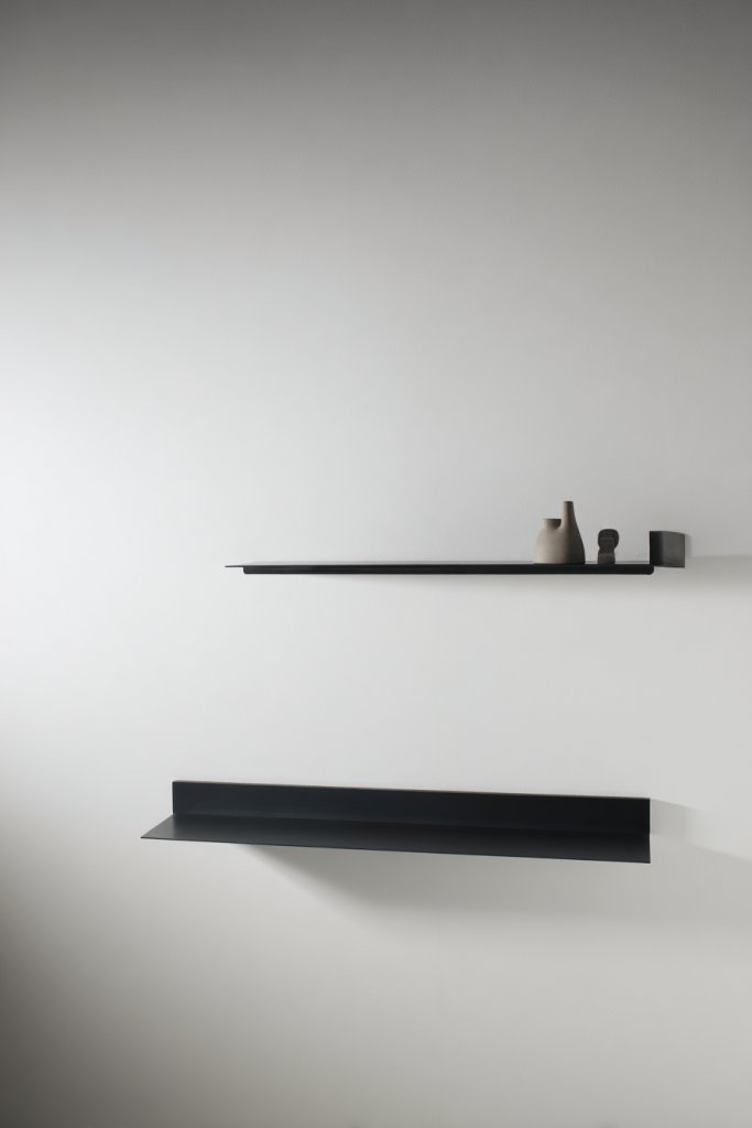 Imagine a set of narrow, matte black floating shelves mounted above your sofa, holding neatly stacked books, baskets, or decorative objects. The shelves appear to ‘float,’ adding a modern, minimalist touch that elevates your decor. The clean lines and open space underneath make the room look larger and less crowded. When illuminated with warm LED strips, they create a soft glow that highlights your display.