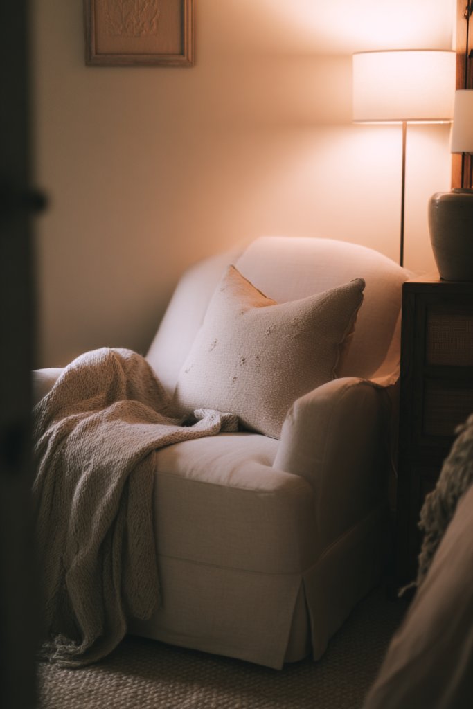 Imagine a plush armchair or a small upholstered chaise tucked into a corner, layered with textured cushions and a soft throw. Nearby, a small side table holds your favorite mug or a candle—minus the clutter of a full living room setup. Soft lighting softly illuminates the space, inviting you to settle in for a while. The overall vibe is relaxed, personal, and stylish.