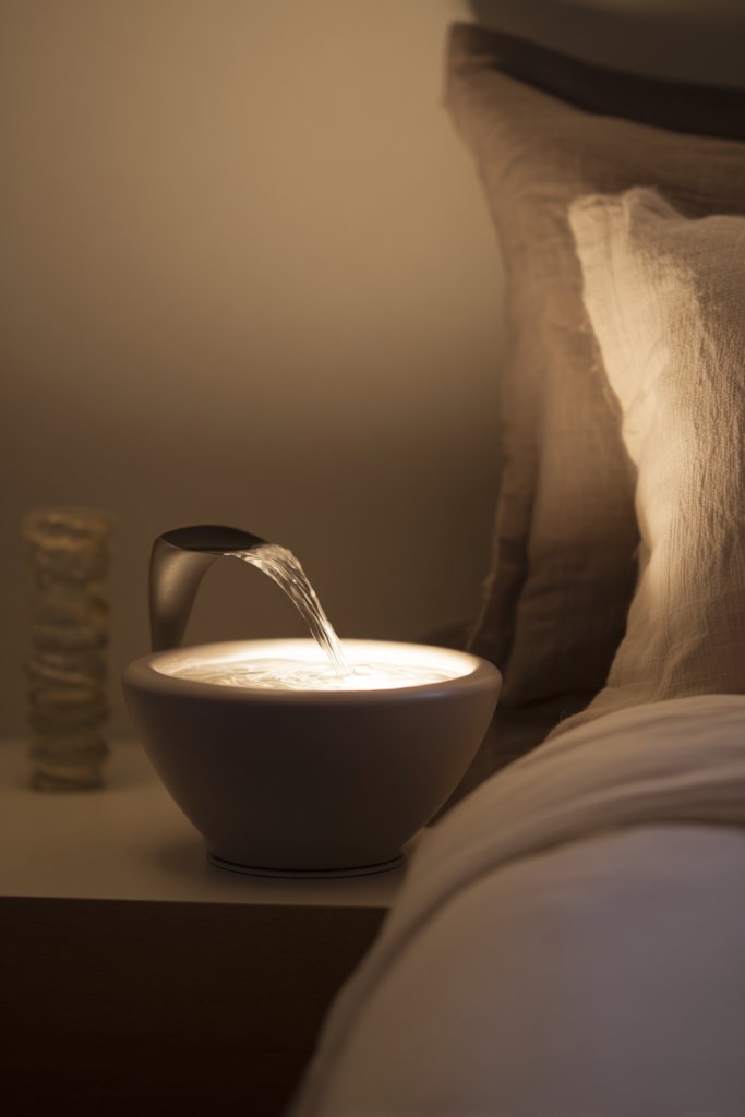Picture a sleek, compact water fountain with flowing water that creates a calming, rhythmic sound. Its stones or ceramic finish complements neutral or earthy decor, blending seamlessly into your space. When turned on, the soft trickle fills the room with a soothing atmosphere, blocking out harsher city noises or household distractions. It’s like having a mini oasis right in your bedroom.