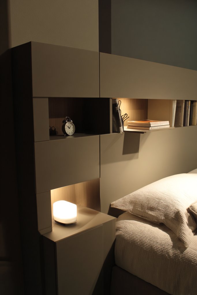 Visualize a sleek wooden or upholstered headboard with open compartments or hidden drawers. It frames your bed, adding texture and interest, while also providing display space for your favorite items—minus clutter. The shelves blend seamlessly into the overall design, creating a cohesive look. Warm lighting integrated into the headboard highlights your personal collection.