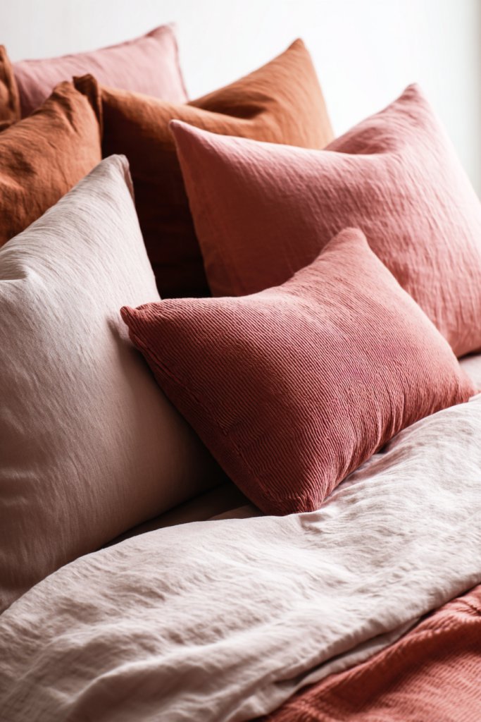 Visualize a bed layered with pillows in shades that match or contrast your bedding—think blush pink pillows on a neutral bed or deep green accents on a grey scheme. Mix textures like velvet, linen, or faux fur to add tactile interest. Arranged thoughtfully, they create a plush, inviting look that encourages lounging and relaxation.