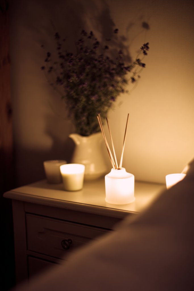 Imagine a small ceramic diffuser releasing a gentle mist of essential oils, filling the room with a calming aroma. Or a set of scented candles in neutral holders placed on shelves or nightstands—avoiding restricted items—casting a warm glow and subtle fragrance. The combination of visual softness and sensory appeal creates a peaceful ambiance that invites you to unwind.