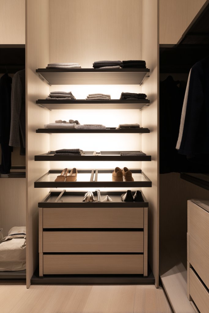 Choose open shelving for easy access or enclosed cabinets for a cleaner look. Use woven baskets, fabric bins, or acrylic containers to keep smaller items organized. Modular systems allow you to customize your layout based on your wardrobe size and style. Consider incorporating a mirror or a small workspace within your closet for added functionality.