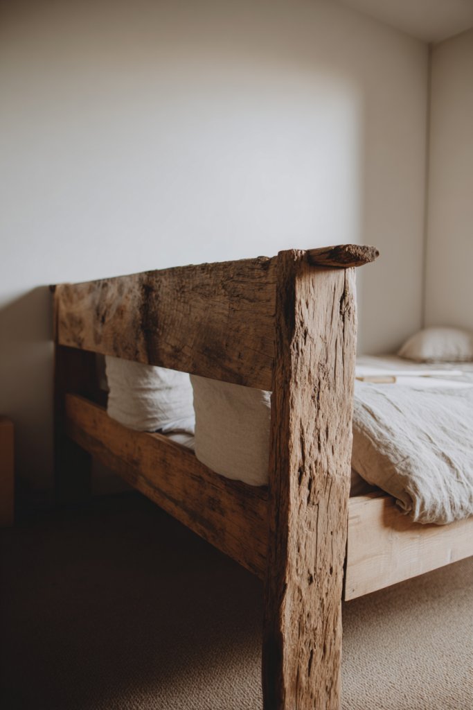 Imagine a bed with a reclaimed oak or pine frame, its natural grains and knots proudly on display. The rough-hewn finish adds texture, while the sturdy construction anchors the room. Complement it with soft, neutral linens and textured throws to enhance the organic feel. The contrast of rustic wood against a soft wall creates a balanced, earthy aesthetic that’s both relaxing and stylish.