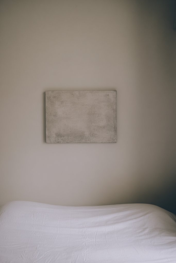 Picture a large, neutral-toned canvas with abstract or nature-inspired textures—think raised brushstrokes, layered fabrics, or embossed details. The subtle textures catch the light, creating visual interest from every angle. Hang it centered above your bed or on an empty wall to create a focal point that balances your decor. The tactile quality invites you to look closer and feel more connected to your space.