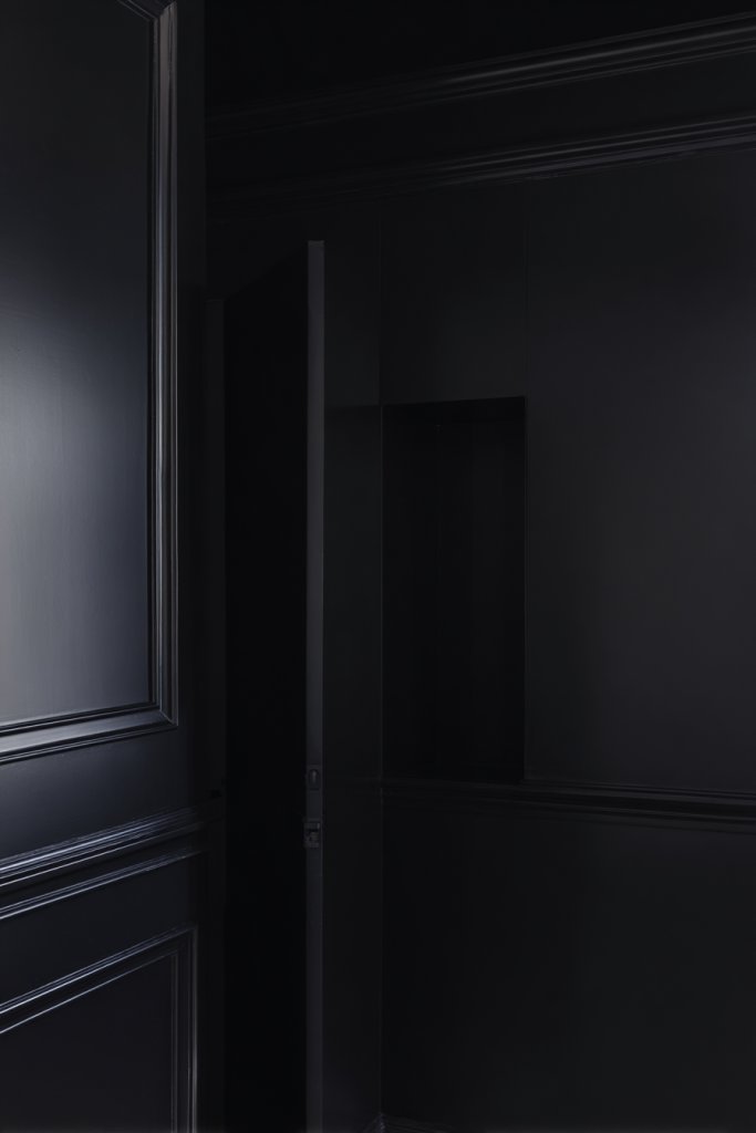 Visualize matte black walls with a subtle, tactile texture—like a soft velvet or sand-like surface. The textured finish absorbs light, reducing glare and adding a cozy feel. The uniform color creates a dramatic canvas for contrasting fixtures and accents.
