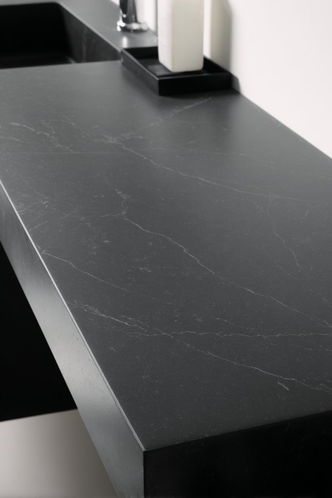 Imagine a sleek black quartz or granite surface that reflects minimal light, hiding fingerprints and smudges. The surface’s smooth, matte or glossy finish provides a modern, luxurious feel. It contrasts beautifully with lighter fixtures or textured walls.