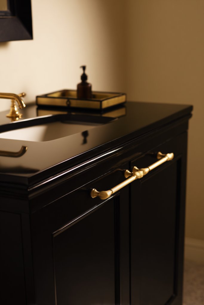 2. Black Vanity with Gold Hardware for Luxurious Contrast