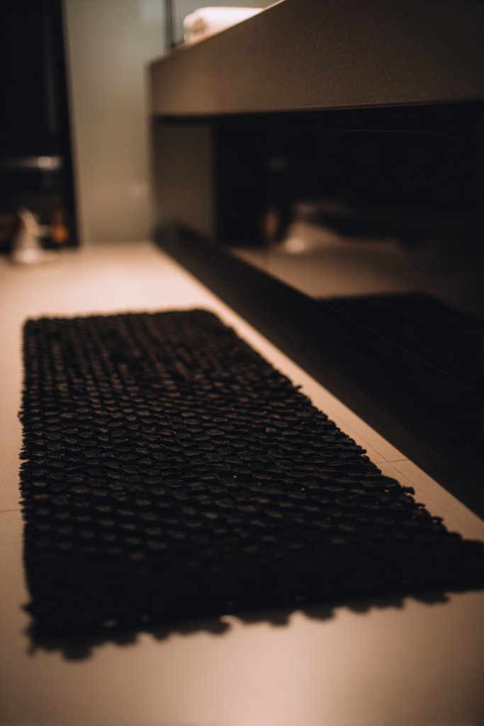 Black textured rugs or mats turn a functional element into a design feature. They create a welcoming, cozy feel that encourages you to relax and enjoy your bathroom. Style and comfort go hand in hand, making your daily routine more pleasant.