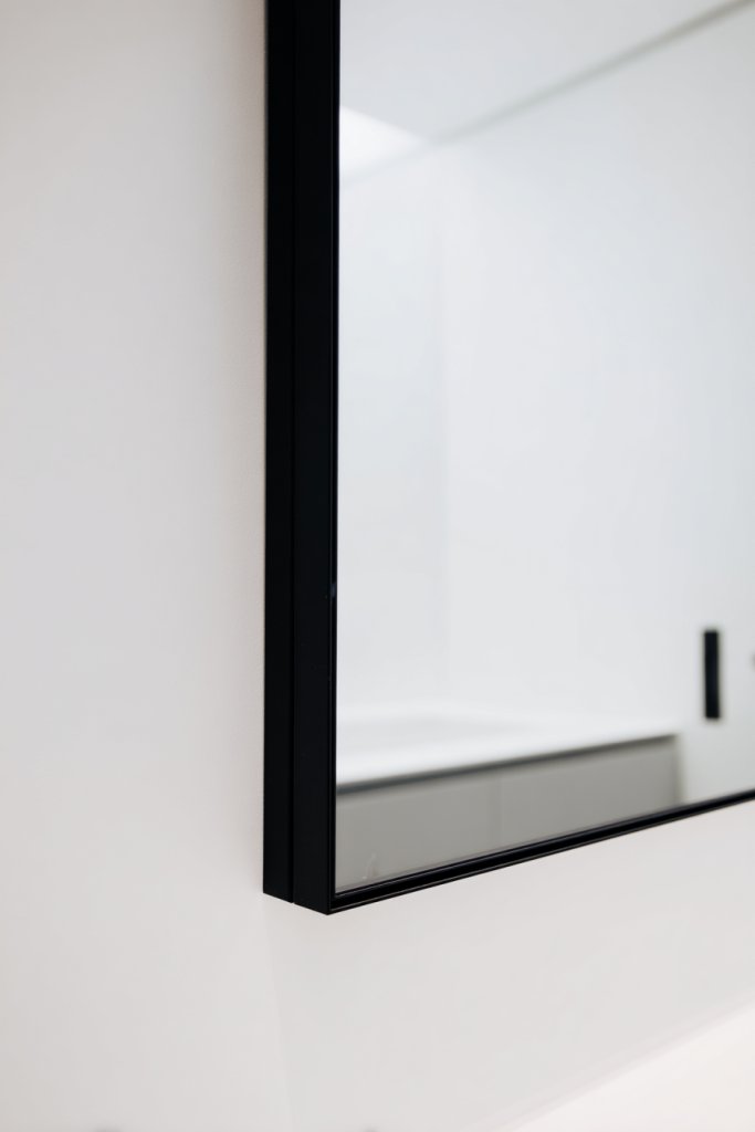 Visualize a large mirror with a thin black edge, mounted flush to the wall. Its reflective surface is crystal clear, creating a sense of openness. The lack of a bulky frame allows the mirror to blend seamlessly into the wall, enhancing the room’s clean lines. The black edging anchors the mirror, giving it a subtle but powerful presence.