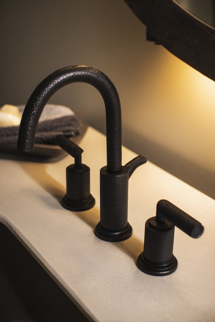 Opt for sleek, angular designs for a contemporary feel or softer curves for a more organic look. Consider wall-mounted fixtures to save space or traditional deck-mounted faucets for classic charm. Coordinate with other hardware like drawer pulls or cabinet handles for consistency. Seasonal accents like warm textiles soften the dark hardware.