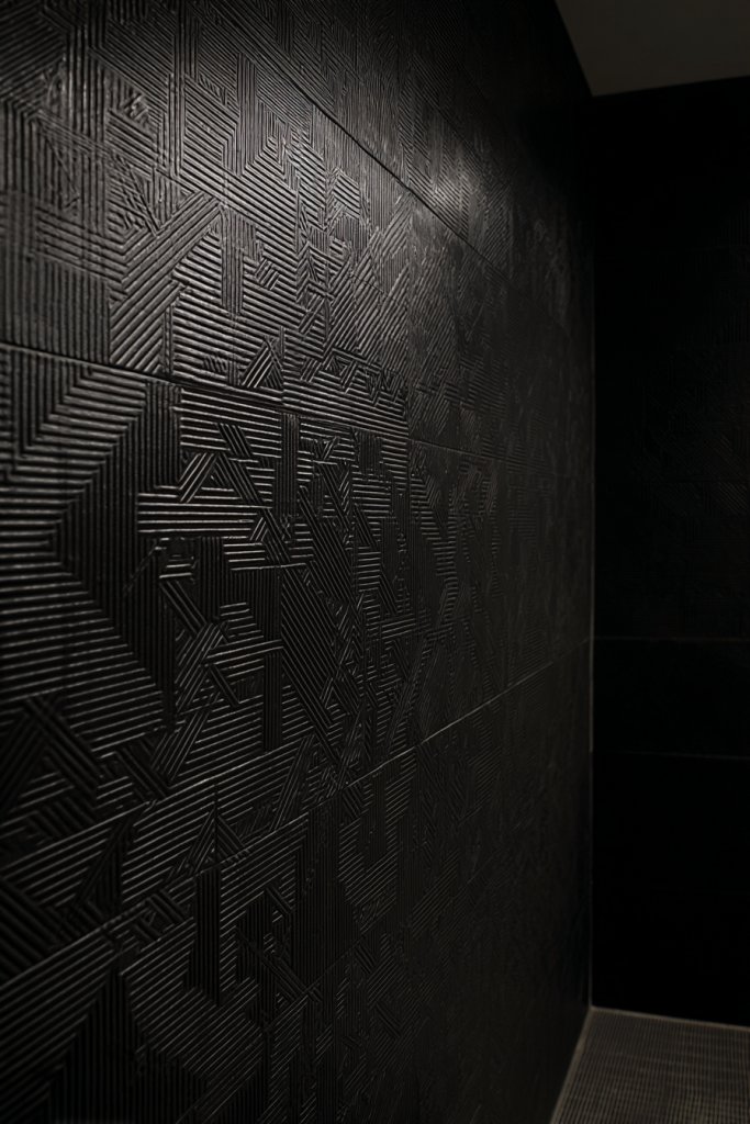 Picture panels with geometric patterns, rippled surfaces, or layered textures in rich black tones. The play of light across the surfaces accentuates their depth, casting subtle shadows. These panels create a dynamic backdrop that elevates simple fixtures into statement pieces.