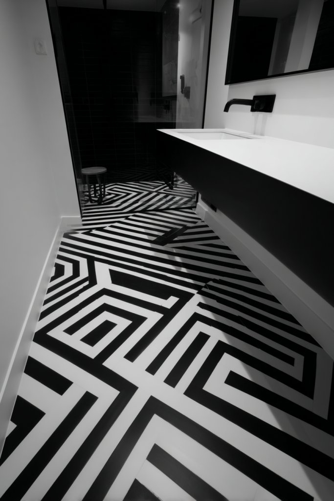 Visualize a floor covered in black and white hexagons or diamonds, creating a striking visual rhythm. The high contrast catches the eye and guides movement through the space. The pattern adds energy and modern flair, especially when paired with minimalist fixtures.