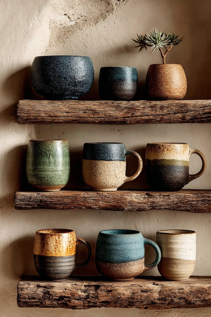 Imagine a collection of handcrafted mugs with textured glazes, each one telling its own story. Display them on open shelves or countertop corners, showcasing their imperfections and unique finishes. The irregular shapes and earthy tones evoke a cozy, artisanal vibe. Their presence invites you to slow down and savor your favorite drinks.