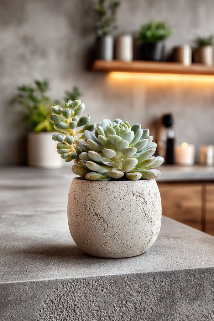 Picture tiny succulents or herbs in sleek, matte ceramic planters, arranged on open shelves or windowsills. Their compact size and clean lines add a fresh, modern touch. The greenery’s subtle shades of green and textures contrast beautifully with warm wall or cabinet colors. The minimalist containers keep the look streamlined and elegant.