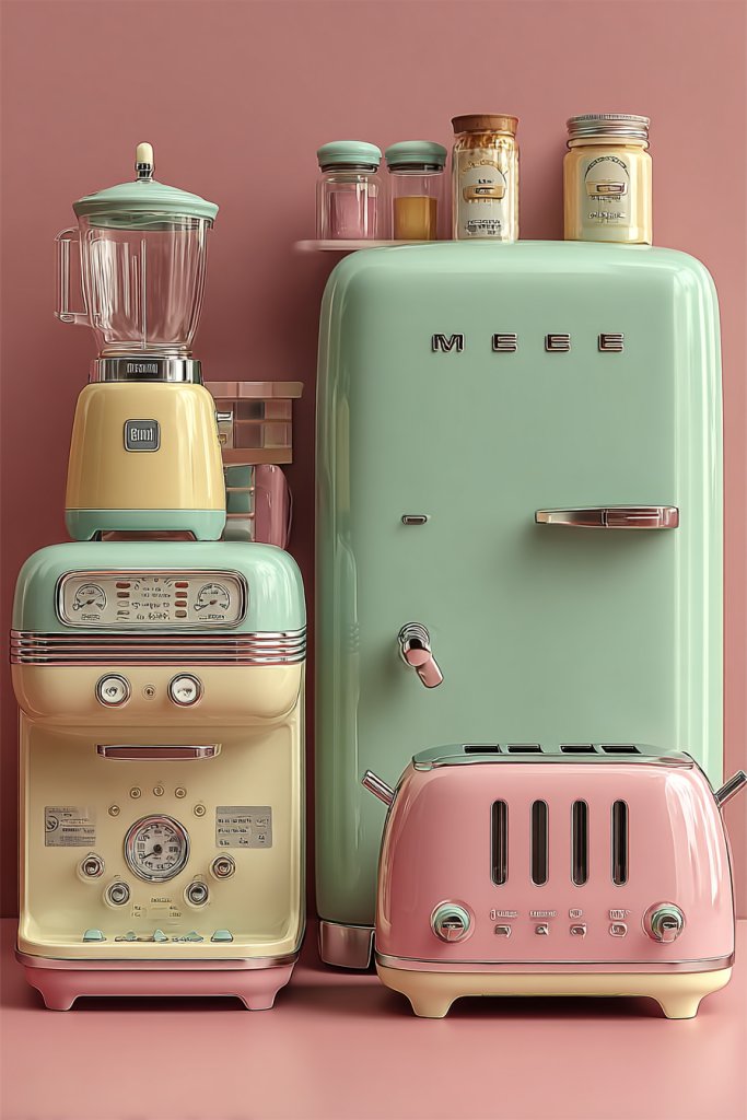 Imagine a soft mint blender, a blush-colored toaster, and a cream-colored kettle arranged neatly on your countertop. These appliances complement warm wall colors and textured surfaces, creating a harmonious look. Their sleek, rounded shapes add a friendly, inviting vibe. The soft hues make them look less like tools and more like decor.