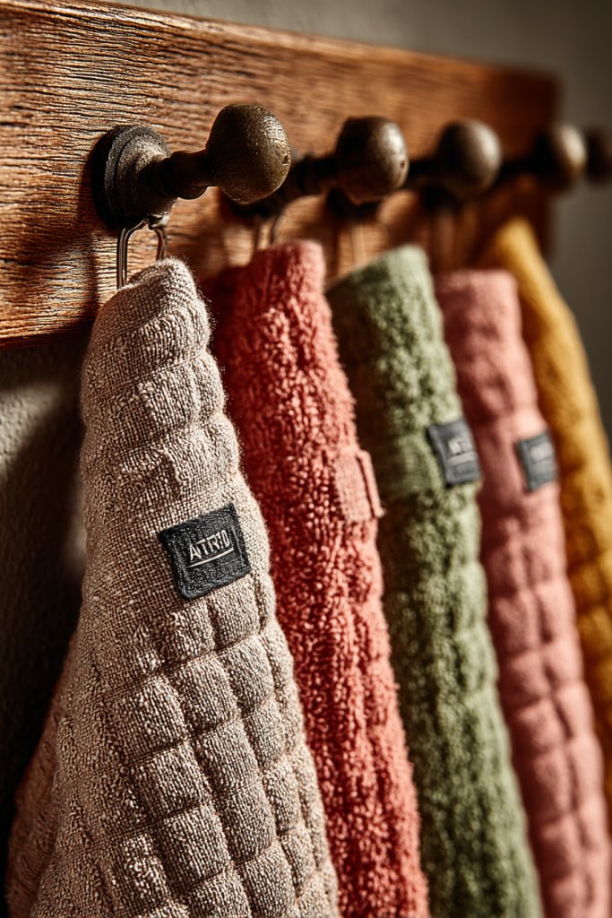 Mix and match colors and patterns to suit seasons or occasions. Use natural fabrics like linen, cotton, or bamboo for an authentic feel. Incorporate embroidered or appliqué details for a handcrafted look. Hang towels with decorative rings or hooks that match your hardware or accents.