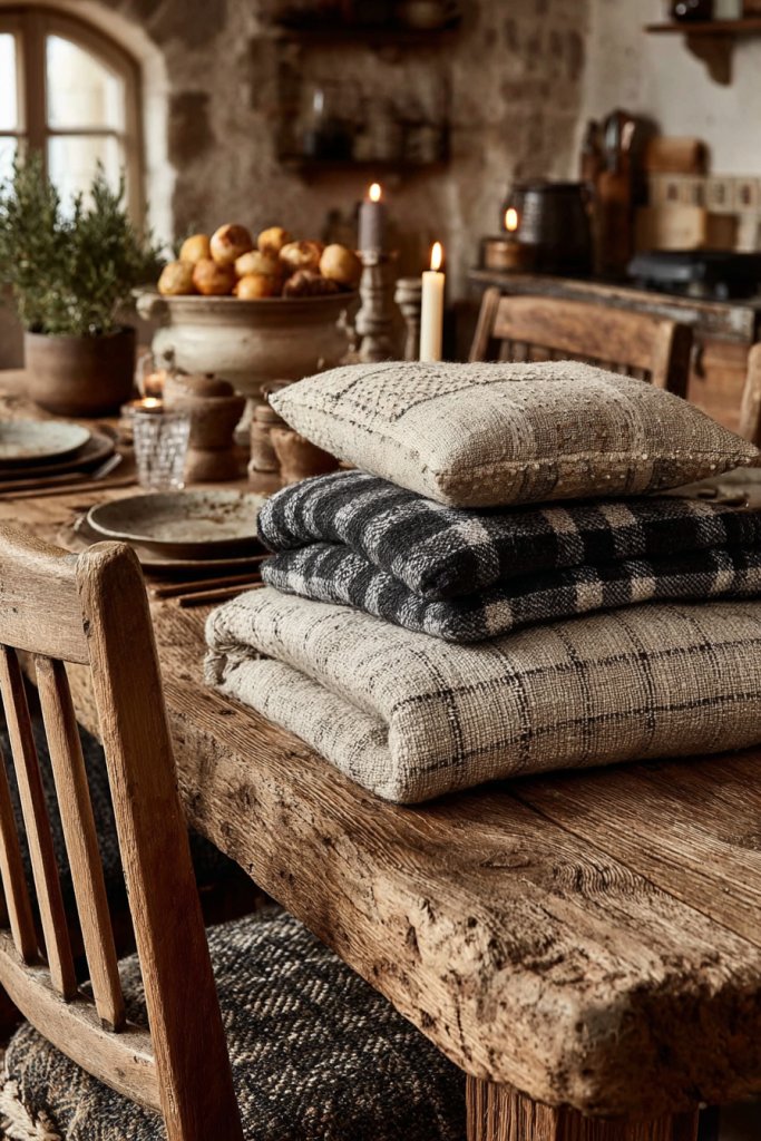 Picture a soft, chunky throw draped over a chair or bench, paired with woven placemats and a textured table runner. Use warm, earthy tones or muted pastels to enhance the cozy feel. The tactile layers add depth and interest, inviting touch and creating a visual focal point. The textures and colors complement your overall decor.