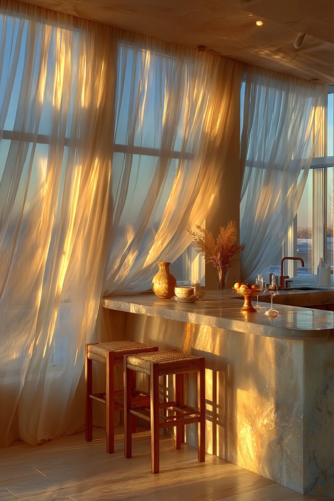Imagine sheer, flowing curtains in light cotton or linen softly filtering sunlight into your kitchen. The fabric’s gentle translucence creates a warm, inviting ambiance. The curtains sway slightly with the breeze, adding movement and life. Soft light highlights textures and colors, making everything appear more harmonious and cozy.