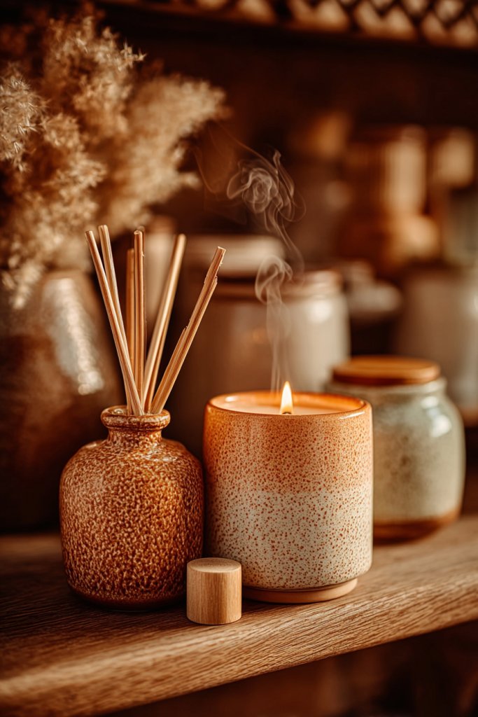 Picture a cluster of softly glowing candles in warm holders or a sleek diffuser emitting a gentle mist. Choose scents like vanilla, lavender, or citrus that evoke warmth and calm. The flickering candlelight or soft diffuser glow adds a cozy ambiance, especially in the evenings. The subtle aroma complements textures and colors, enriching the sensory experience.