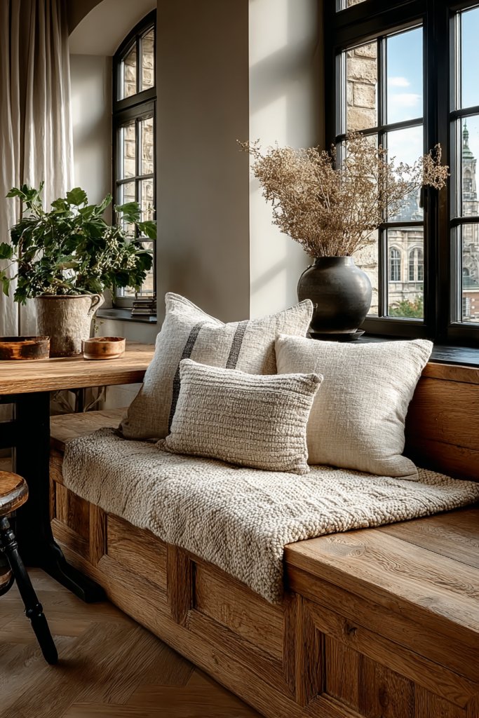 Imagine a small alcove with a cushioned bench nestled under a window, draped in soft fabrics. Layer it with plush cushions in varied textures—knits, velvets, or linen—to add tactile warmth. A small side table or shelf nearby holds your favorite books or a steaming mug. The scene feels relaxed, welcoming, and perfect for lingering over coffee.
