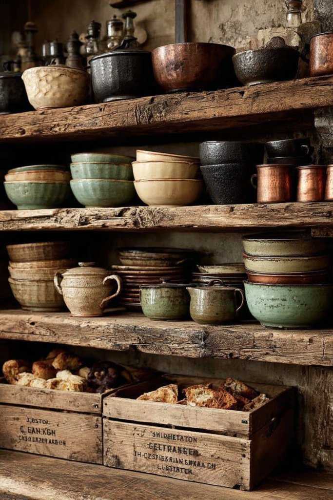 Picture rough-hewn wooden shelves mounted on a painted or exposed brick wall. They hold a collection of vintage plates, cups, and copper pots that gleam with age and character. The mix of textures—aged ceramics, shiny copper, and weathered wood—creates a cozy, inviting scene. Small hooks or baskets can add further charm and functionality.