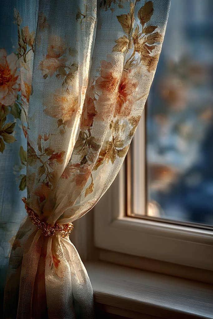 Picture lightweight linen or cotton curtains in muted tones or subtle patterns gently framing your windows. They sway softly in the breeze, casting a warm glow when the sun filters through. The textures add dimension, while the prints bring a touch of personality. They create a cozy, inviting view from inside and outside.