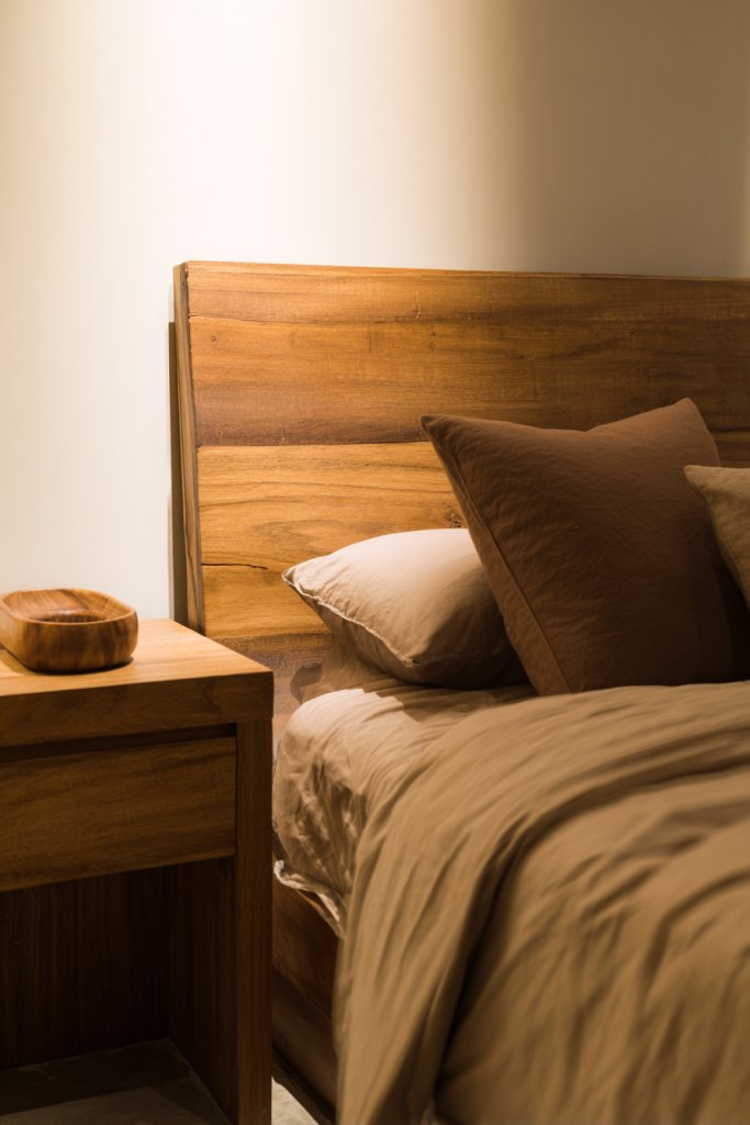 Select quality wood furniture with smooth finishes and sturdy construction. For a headboard, consider DIY options like pallet or reclaimed wood panels. Use natural oils or waxes to enhance the wood’s appearance and protect it. Combine with textiles like linen or cotton in neutral shades to complement the warmth. Maintain wood surfaces with regular dusting and occasional polishing to preserve their beauty.