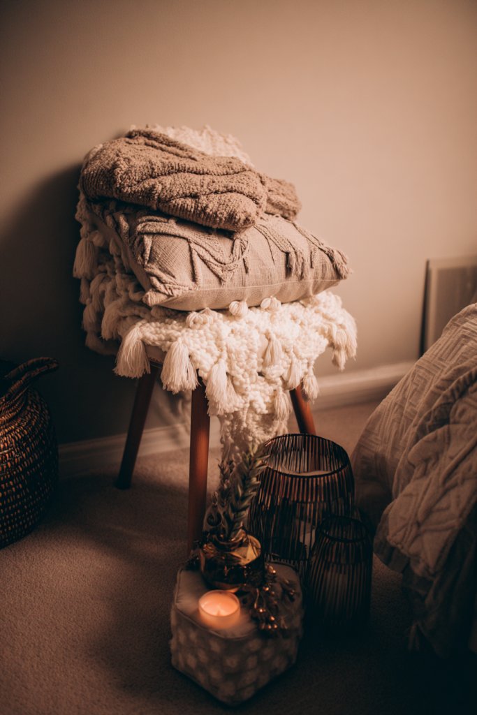 Imagine a small nook with a plush floor cushion or a comfy bean bag, layered with textured throws and pillows. The corner is accented with a soft, chunky blanket and maybe a small, decorative side table or a basket for books and essentials. Ambient lighting—like a small lamp or string lights—complements the textiles. Personal items like a favorite mug or a treasured figurine complete the inviting vibe.