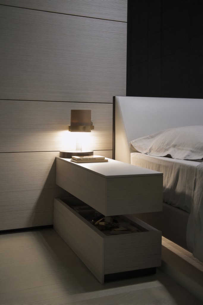 Imagine sleek, simple nightstands with clean lines and hidden drawers or shelves. They hold your nightly essentials—like a glass of water, a book, or a phone—out of sight but within reach. The uncluttered surface emphasizes calmness, while the storage keeps your space tidy. Soft lighting from wall sconces or integrated lamps complements the minimalist aesthetic, emphasizing the sleek design and quiet elegance.