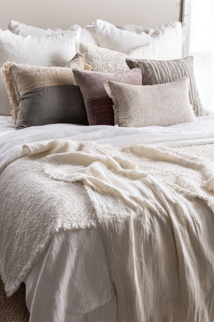 Imagine a bed dressed with a soft cream throw blanket with chunky knit texture, complemented by a variety of pillows in velvet, linen, and embroidered fabrics. The different textures catch the eye and invite touch, making the bed look more inviting. Colors like blush, taupe, and warm gray blend seamlessly for a sophisticated yet cozy vibe. The layered arrangement creates depth, making your bed the centerpiece of your sanctuary.