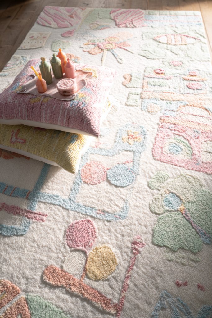 Bare floors can feel cold and uninviting, especially in a whimsical space. Patterned rugs and mats instantly add warmth, color, and personality underfoot. They tie the room’s decor together while creating a cozy atmosphere everyone loves to sink into. Plus, they’re easy to switch out for a fresh look.