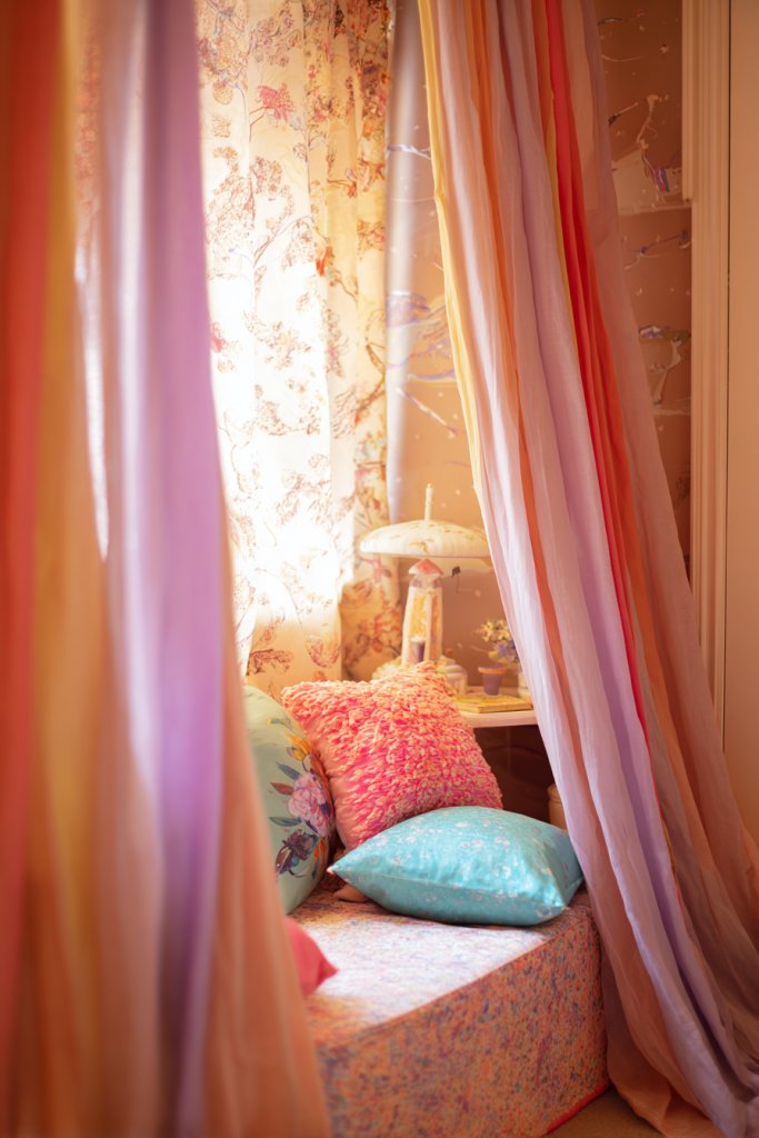 Picture a colorful fabric tent with tassels and patterns, set up in a corner or against a wall. Inside, plush cushions and fairy lights turn it into a cozy retreat. The fabric’s bright hues and playful design evoke childhood adventures or fairy-tale worlds. It’s a magical spot where imagination runs wild, making your room more inviting and lively.