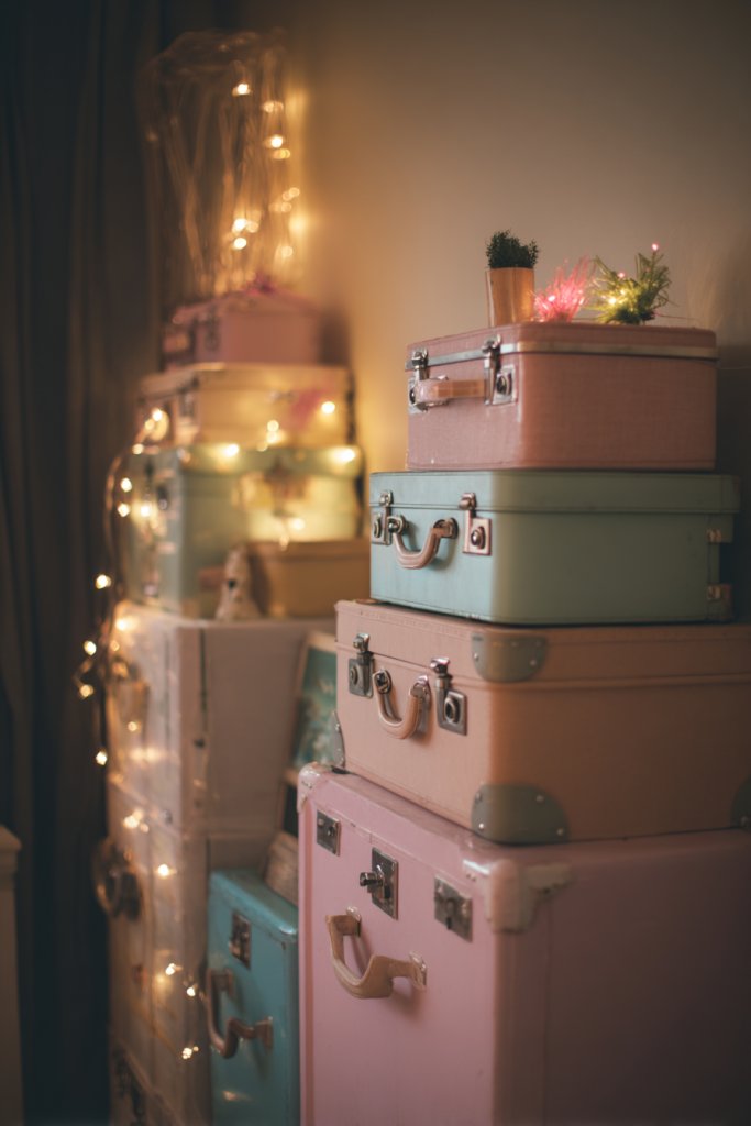 Picture a stack of colorful, retro suitcases in a corner, topped with a cozy blanket or decorative pillow. The varied patterns and textures create visual interest and evoke a sense of adventure. When opened, they reveal hidden storage for books, toys, or accessories, keeping your space tidy without sacrificing style. Their aged patina and unique hardware add an authentic vintage vibe.