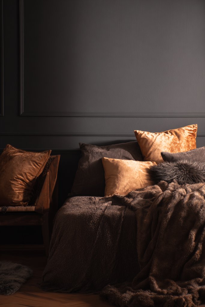 Picture walls painted in rich, velvety charcoal with plush throws draped over a cozy armchair. Soft, tactile cushions in warm beige or caramel add contrast and comfort. A textured rug in muted tones anchors the room, inviting your feet to sink in. Ambient lighting casts a gentle glow, highlighting the interplay of matte and glossy surfaces. It’s a space that feels both elegant and snuggly, like your personal sanctuary.