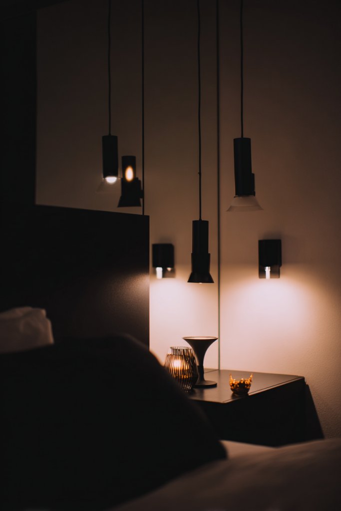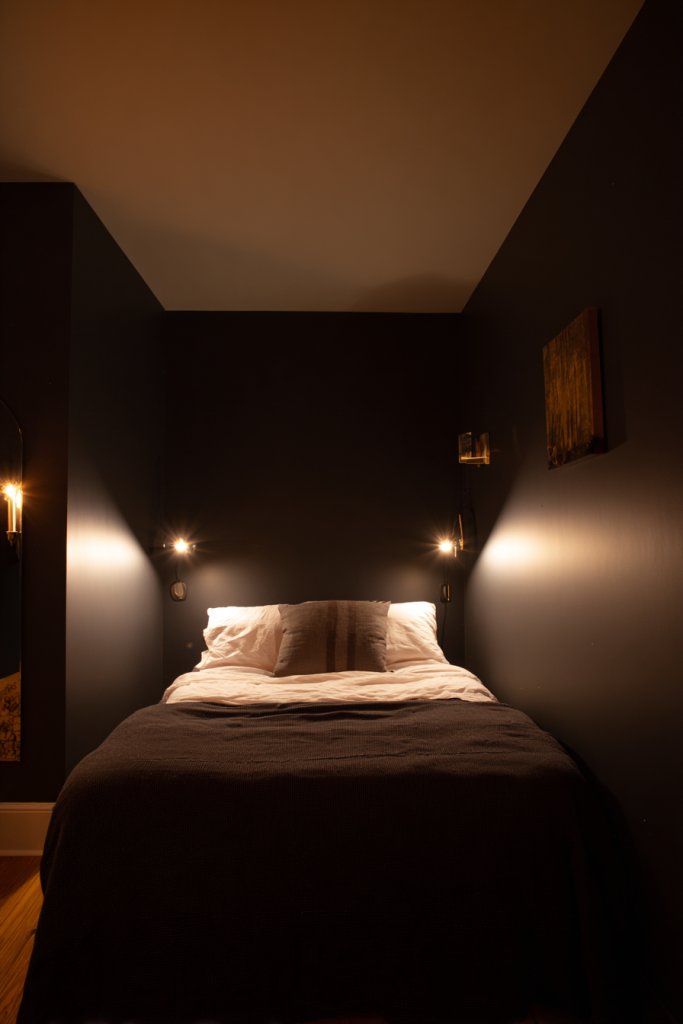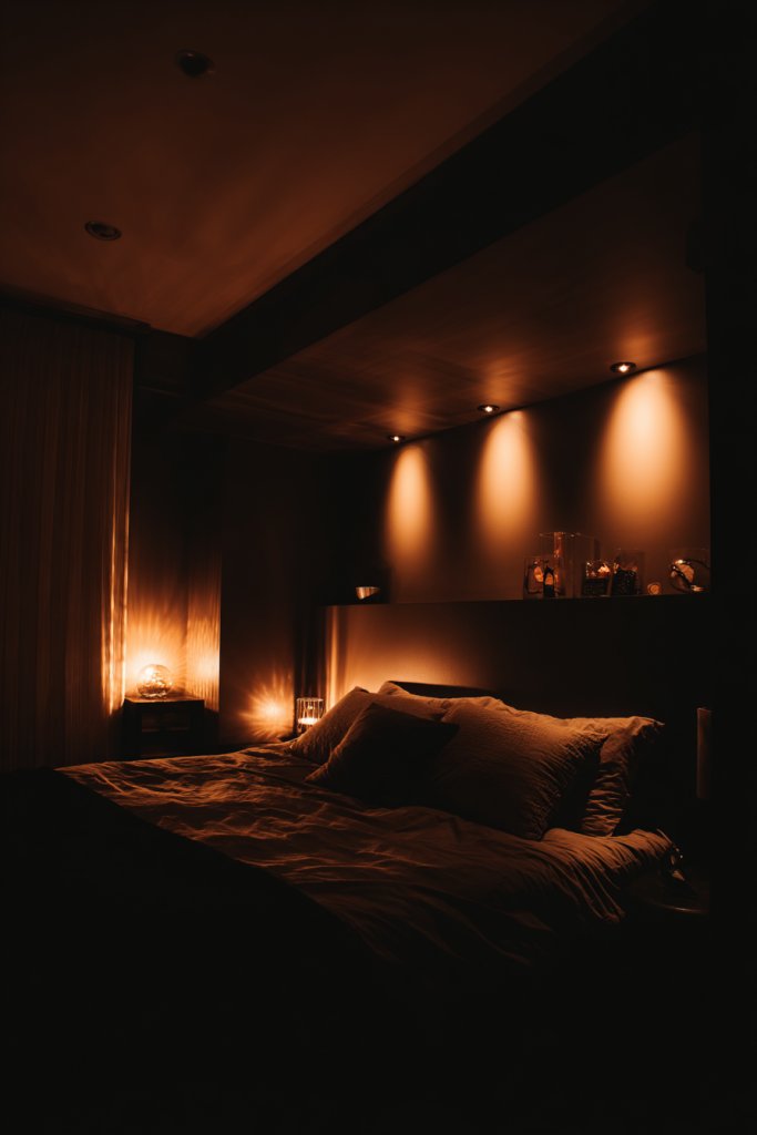 Personalize your lighting with smart controls to change colors or set schedules. Add decorative fixtures like vintage-style sconces or sculptural lamps in dark finishes. Use warm-toned bulbs with high CRI (Color Rendering Index) for natural-looking light. Incorporate dimmable reading lights on either side of the bed for functionality. Play with shadows and highlights to enhance textures and architectural features.