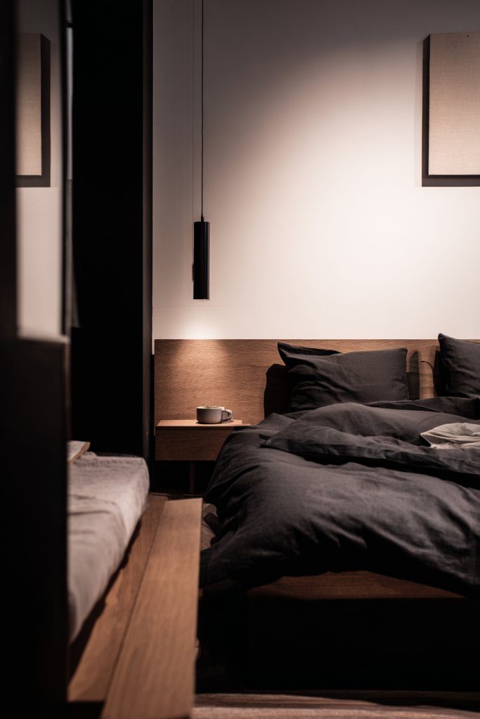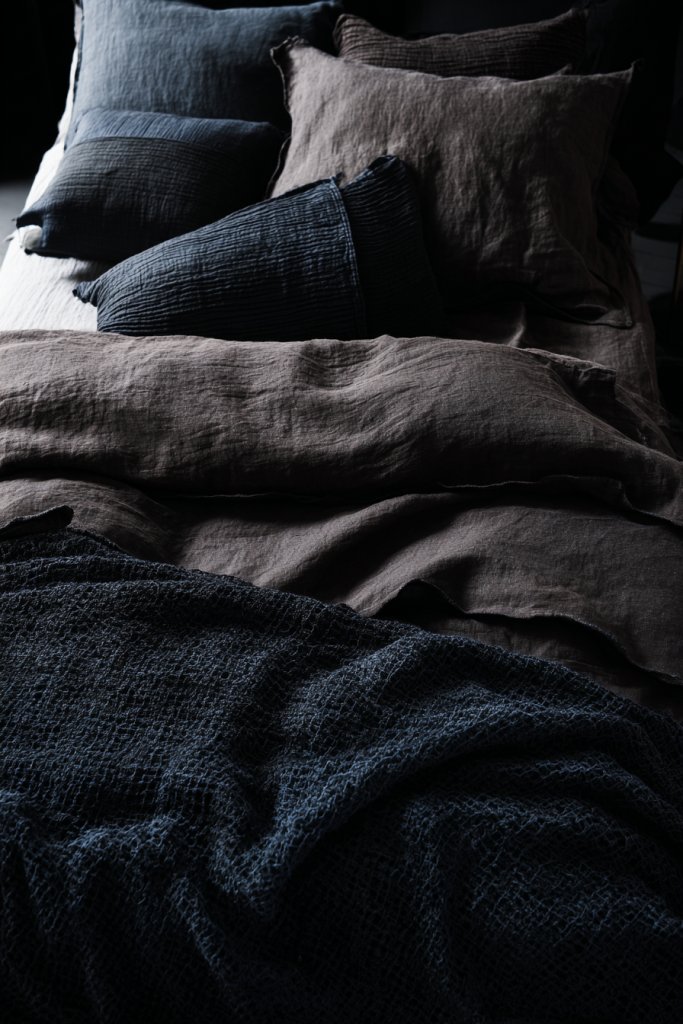 Select high-quality linen sheets in dark shades like slate or deep gray. Add textured throws and cushions in complementary colors and fabrics. Use a variety of textures—knit, velvet, embroidered—to create tactile interest. Keep bedding in crisp, well-pressed condition for a polished look. Incorporate soft lighting to highlight the textures and layers. Regularly refresh with new cushions or throws to keep the look lively.