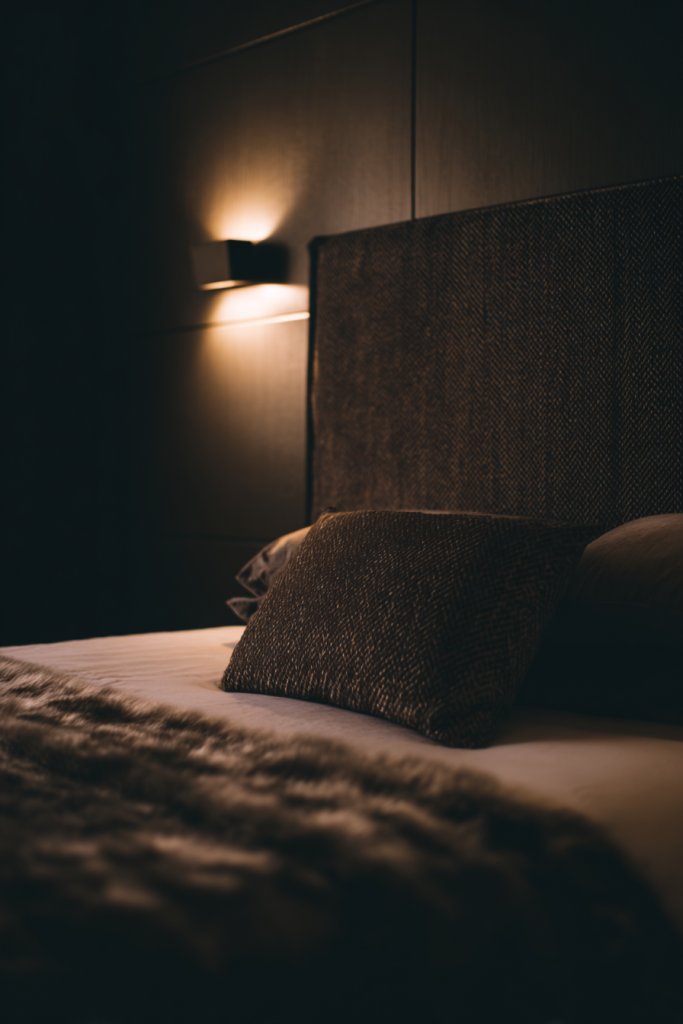 15. Dark, Textured Headboard with Soft Lighting for Intimacy