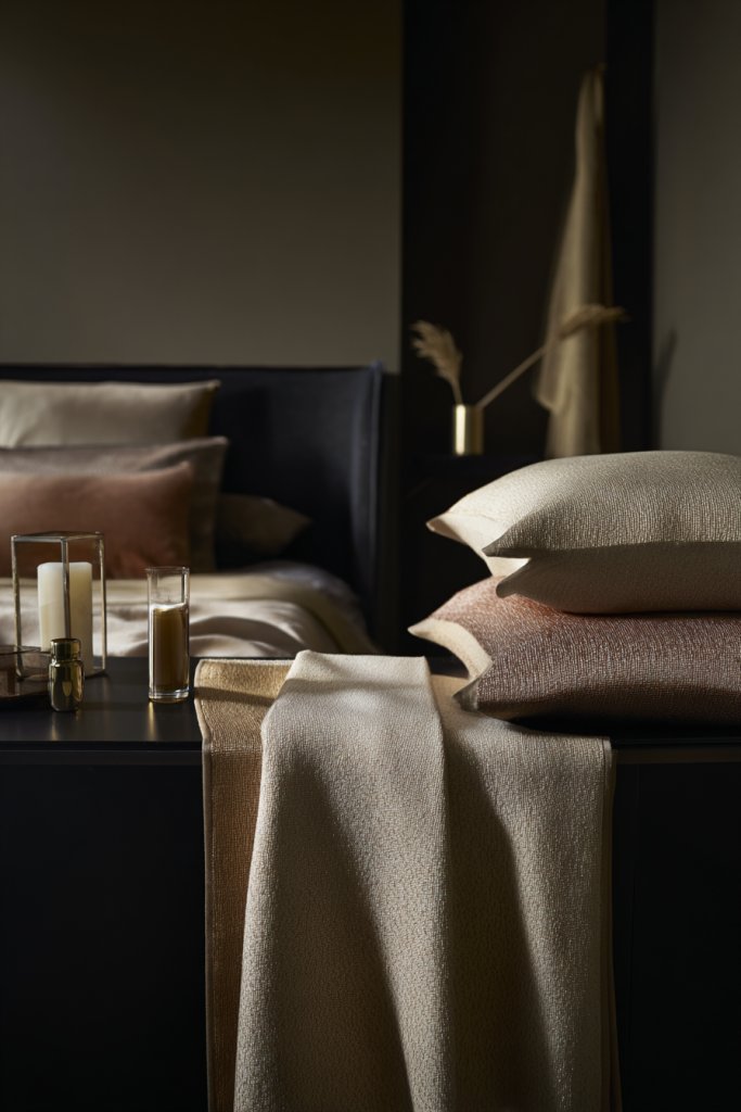 Imagine a bed dressed in deep charcoal linen sheets with a chunky knit throw in a contrasting shade like soft taupe or cream. Mix and match textured cushions—velvet, boucle, or embroidered—to add tactile richness. The layers create a visual feast, inviting you to run your hand over the fabrics. Ambient lighting softly highlights the textures, making the bed the ultimate retreat. It’s a perfect balance of sophistication and comfort.