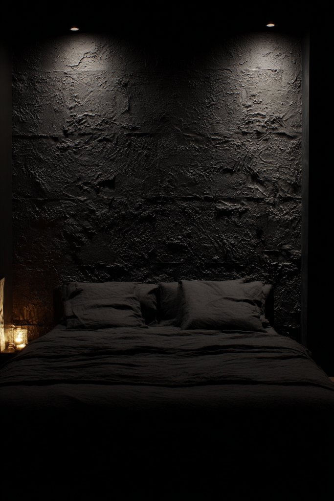 Imagine one wall painted in a deep navy or black matte finish, illuminated softly with hidden LED strips or wall sconces. The textured or matte surface absorbs light, creating shadows and dimension. Gentle uplighting or backlit features highlight the wall’s depth, making it the room’s star. Surrounding it with lighter bedding and decor balances the darkness, resulting in a harmonious, captivating space.