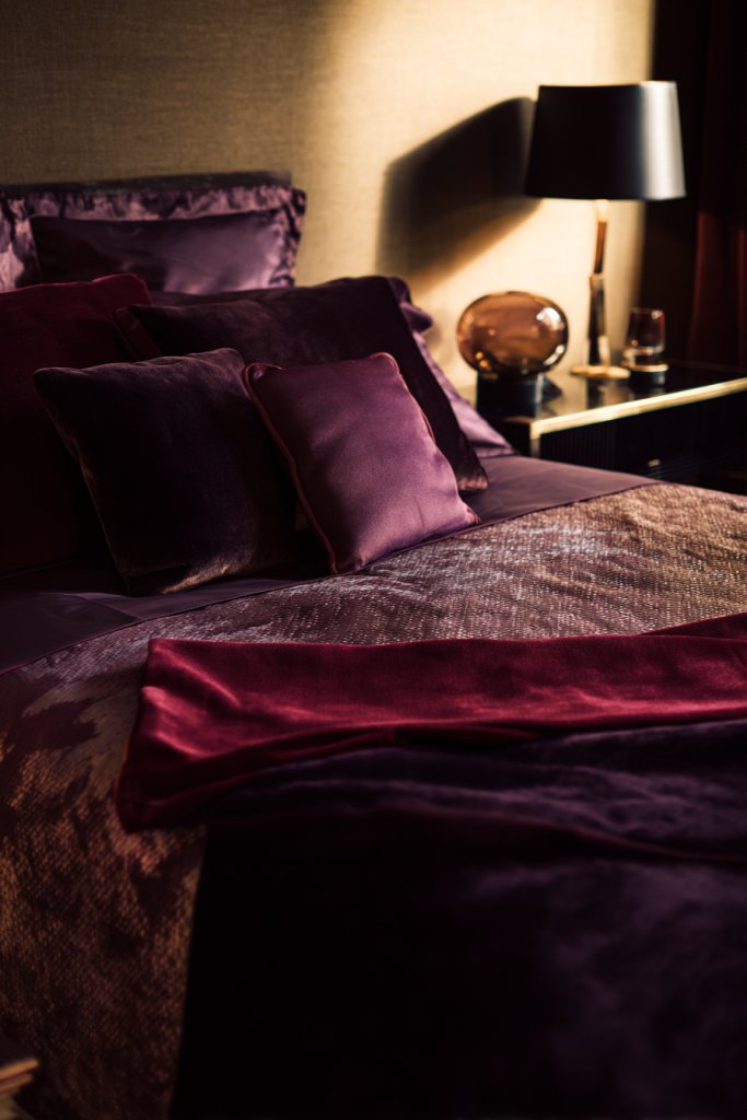 Picture a bed dressed in deep burgundy silk sheets with matching velvet cushions. A plum-colored duvet adds warmth and richness, contrasting beautifully with neutral walls. Gold or bronze accents in decorative trim or throw pillows add a subtle shimmer. Soft, ambient lighting highlights the luxurious textures, making the bed the room’s focal point. It’s a lush, inviting scene that screams comfort and opulence.