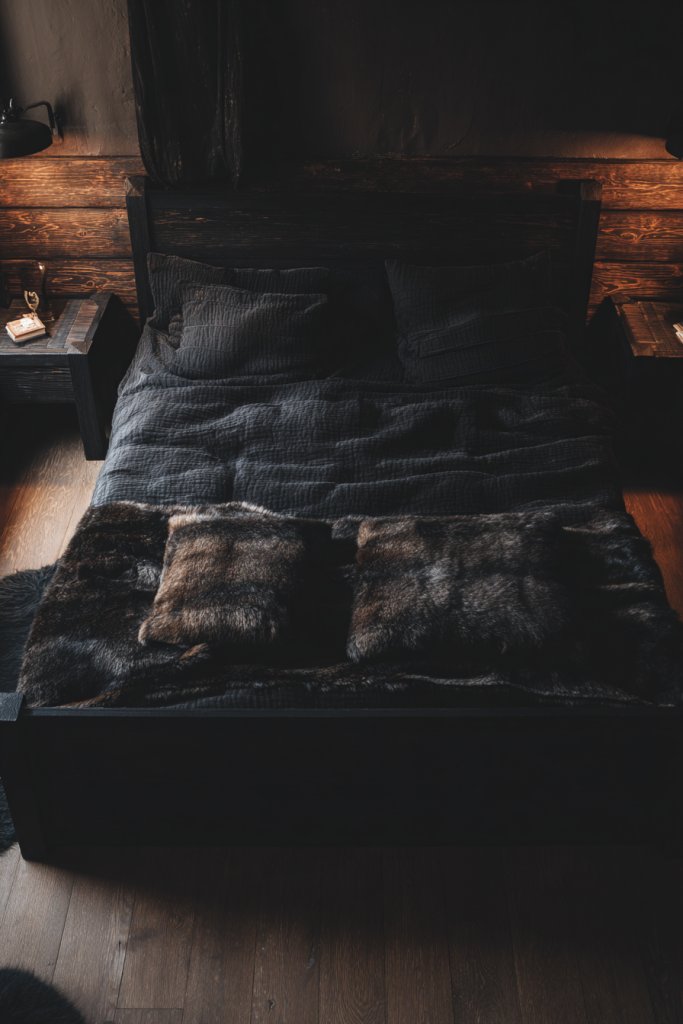 Picture a sturdy dark wood or matte black bed frame with a plush, inviting duvet. Layer it with textured throws and cushions in rich fabrics like velvet or chenille. The dark frame grounds the room, creating a sense of solidity, while the layered bedding invites relaxation. Soft lighting highlights the rich grains or matte finish, emphasizing the bed as the focal point. The overall look balances strength and comfort perfectly.