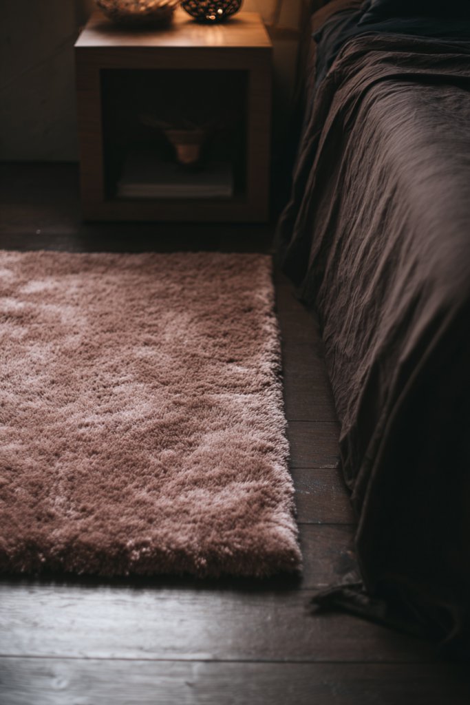 Choose a rug with a dense, plush pile in neutral or dark muted tones. Position it under the bed, extending beyond the sides for a balanced look. Use a non-slip rug pad underneath to prevent slipping and protect your floors. Vacuum regularly and clean spills promptly to maintain softness. Layer multiple rugs if desired, but keep their tones cohesive for a harmonious effect. The goal is comfort with style.