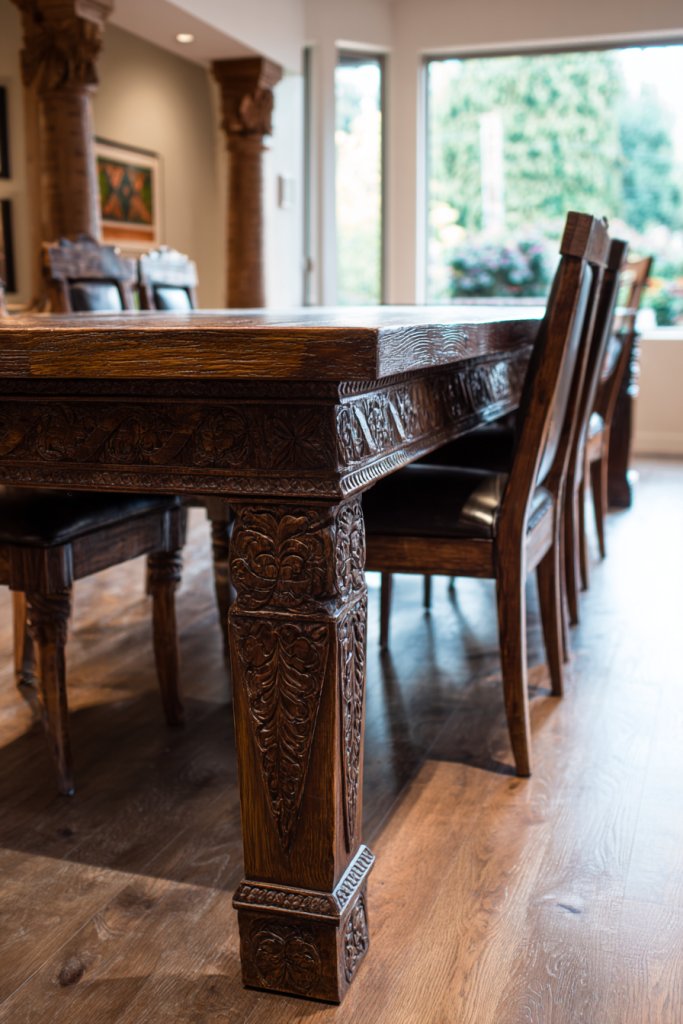 Picture a rich, dark mahogany table with intricate carvings along the edges and legs. The polished surface reflects warm light, highlighting the detailed inlays or scrollwork. Surround it with plush upholstered chairs, and you instantly create a regal and welcoming atmosphere. The textures and craftsmanship evoke warmth and tradition.