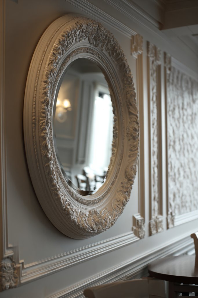 Imagine a large, ornate mirror with carved details reflecting the room’s features or a set of textured panels with geometric patterns framed by crown molding. The mirror not only enlarges the space but also adds a luxurious vibe. Decorative panels can introduce pattern and dimension, transforming plain walls into artful focal points.
