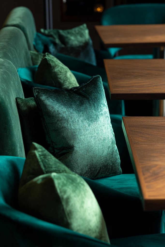Picture chairs in lush velvet in deep emerald or rich burgundy, with cushions in silk or embroidered fabric. The soft textures contrast beautifully with sleek table surfaces and plain walls, adding layers of visual interest. The subtle sheen catches light, making the room feel more vibrant and inviting.
